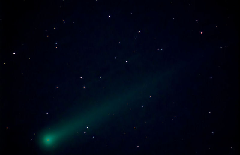 Comet was moving at almost 6 arc-minutes per hour which resulted in a lot of star trails. Applied techniques shown in Dec 2013 edition of Sky&Telescope "Capturing Comets" article by Chris Cook to create an image of the comet and the background stars without trails... Great article Chris! |