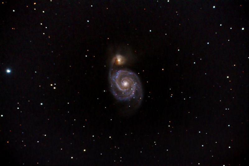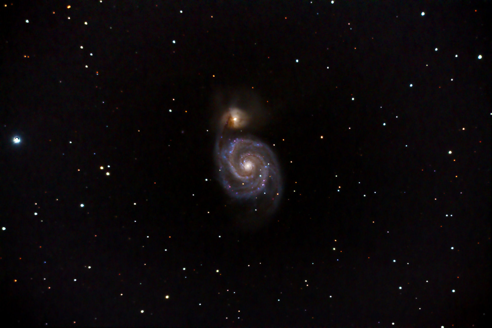 Could not get a good guide star onto my guide chip in the ST-11000 camera. Decided to take short unguided images of two minutes duration. The result surprised me. Sure beat my earlier film shots: In order to take two minute unguided images, you have to have very good polar alignment. I always use the "iterative alignment" method that I invented (at least I independently invented it in December 1994 since I was unaware at that time of anyone using such a method.) I didn't want to waste a lot of time doing the "drift" method. It always sounded like the "drift" method wasted a lot of time and would not be as accurate as iterative alignment. I used the iterative alignment method to align the scope in New Mexico when I first set up the scope. I probably should do a 5 minute test to see if I can get away with 5 minute shots with no star trails... |