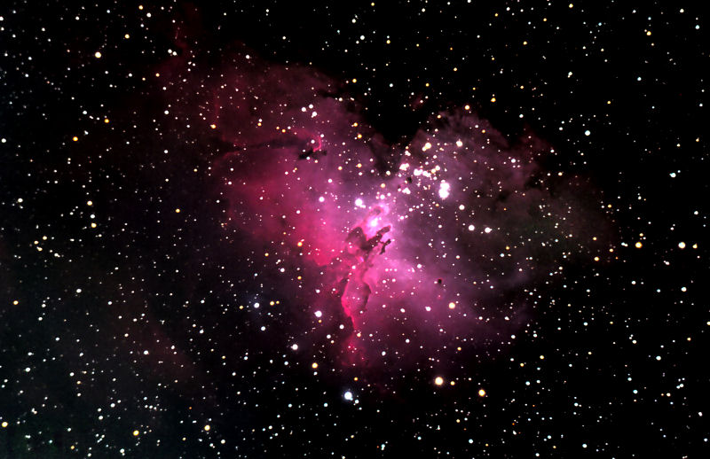 This was a day or two after a super-bright full moon. I was getting blooming in the 10 minute Luminance star images so I then did some 5 minute Luminance images but still had a bit of blooming. Finally used manual debloom in Maxim DL to handle the problem. I need to re-shoot this during a new moon to see if more detail emerges. I had thought this object was more red but my earlier images are consistent with this image. I used ExCalibrator to try to set the "true color" of this latest image... Earlier images I took of this object showing that my latest image is an improvement over them: Film: http: //www.astroshow.com/astropho/eagle.htm |