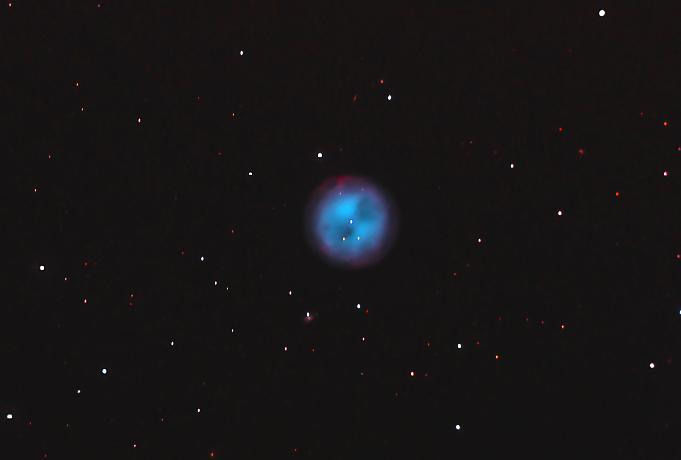 This is a "planetary" nebula. Color corrected through use of the eXcalibrator free-ware. I was happy to see the subtle red outer regions of this nebula. They did not appear when I tried to shoot this object with 10 minutes of L, and 5 minutes of R, G, and B. The longer exposure time appears to have been required. |