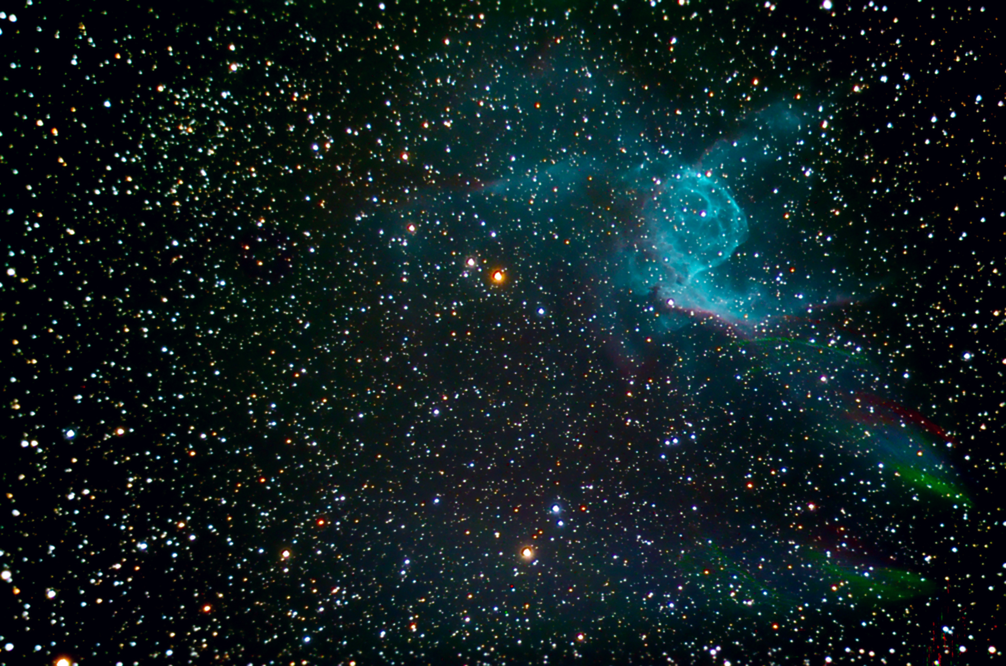 NGC2359 Often referred to as "Thor's Helmet". If you tilt your head to the right, you can see the "helmet" with two horns sticking up... The red and green colors showing up to the lower right of the image surprised me. The Vela nebula often shows such colors but I was not aware that this area of the sky contained anything similar... |