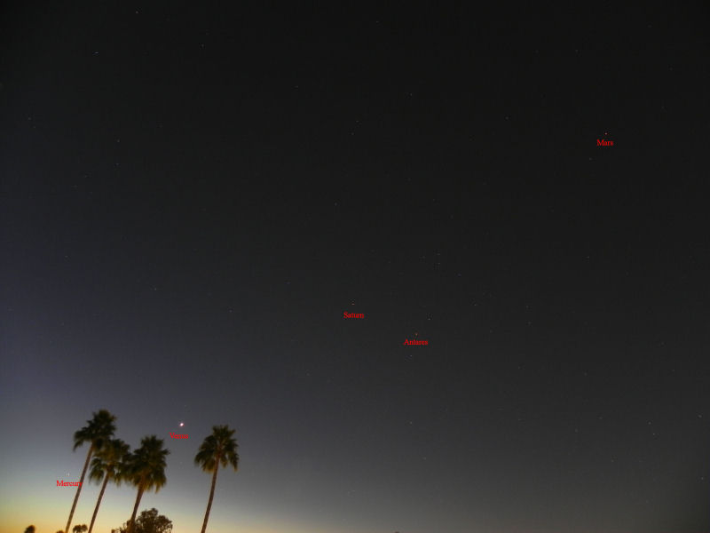 4th floor balcony. Jupiter was above and to the right and out of the frame so I didn't get Jupiter... Believe I have correctly identified Mercury though. Only other time I saw Mercury was when my telescope found it some years ago... Mercury is rather difficult to see... |
