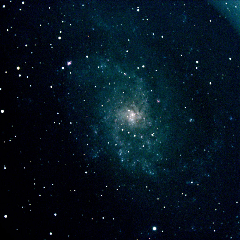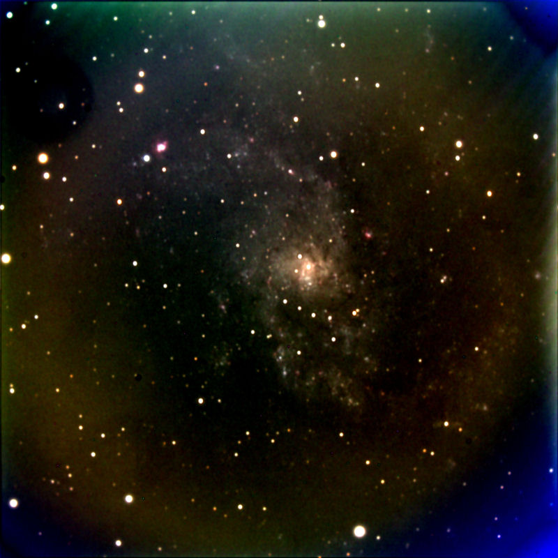 Nowhere near the best image ever taken of this object but probably as good as I can get here in heavily light-polluted Tempe, AZ. Finally made some sky flats and applied them. That made a BIG difference! It got rid of red green and blue dots caused by "hot" pixels generated by the imaging chip and got rid of dark spots caused by "cold" pixels generated by the imaging chip. Also any "dust donuts" were eliminated - There was only one tiny one and it was not being seen in this image anyway... I used handyAvi to make 5-minute sky flats. HandyAvi has an option to move the telescope about in a square during the process so that stars do not get captured in the image... Still not sure what happened in upper right corner. Don't think there should be a bright area there... Maybe need to do sky-flats again? |