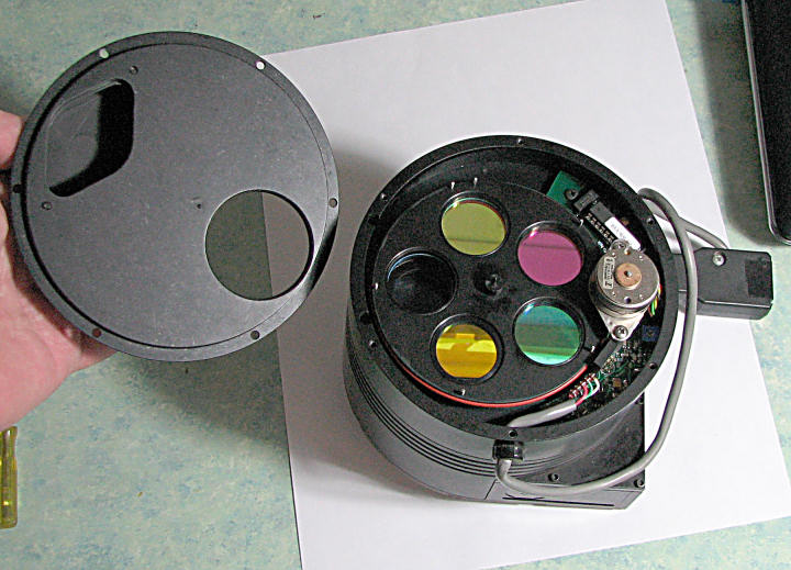 Holding the removed CFW-8 cover plate and showing the filter wheel, the